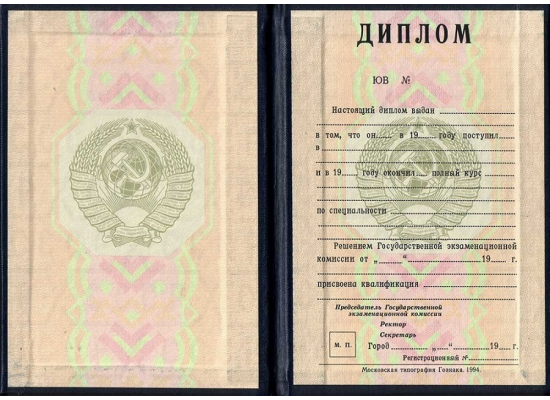Покупая диплом специалиста 1970 - 1996 гг. в Компании «EXPRESS-Дипломы», вы можете быть уверены в его достоверности и соответствии государственным нормам и требованиям. Мы гарантируем, что наши Диплом специалиста 1970 - 1996 гг. заполняются по учебному плану нужного учебного заведения на нужный год окончания, делается всё по уставу.