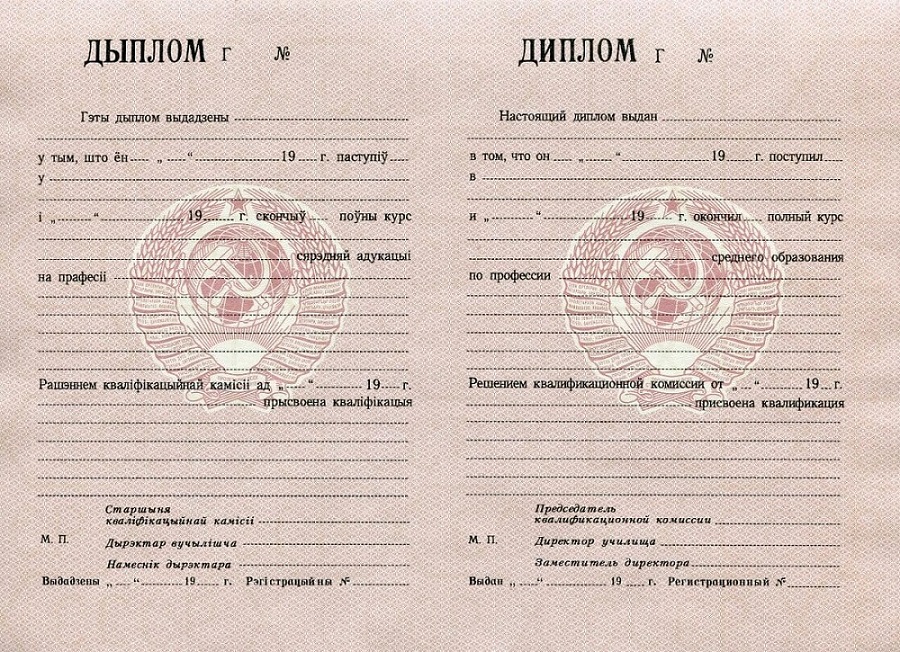 Диплом ПТУ / училища Белоруссии 1970 - 1993 гг.