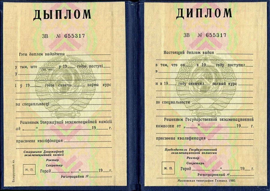Диплом о высшем образовании Белоруссии 1970 - 1993 гг.
